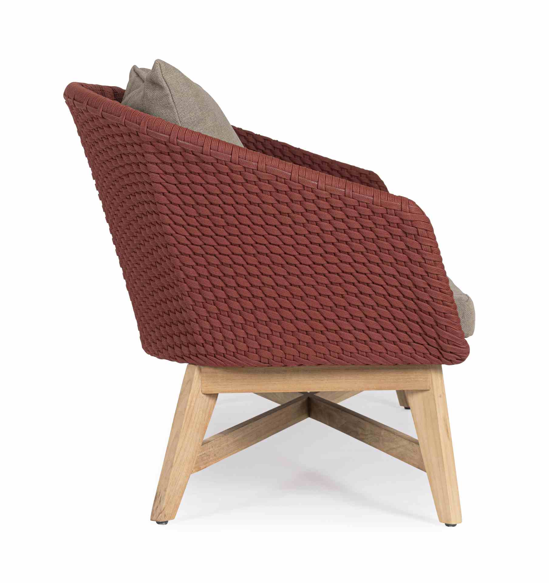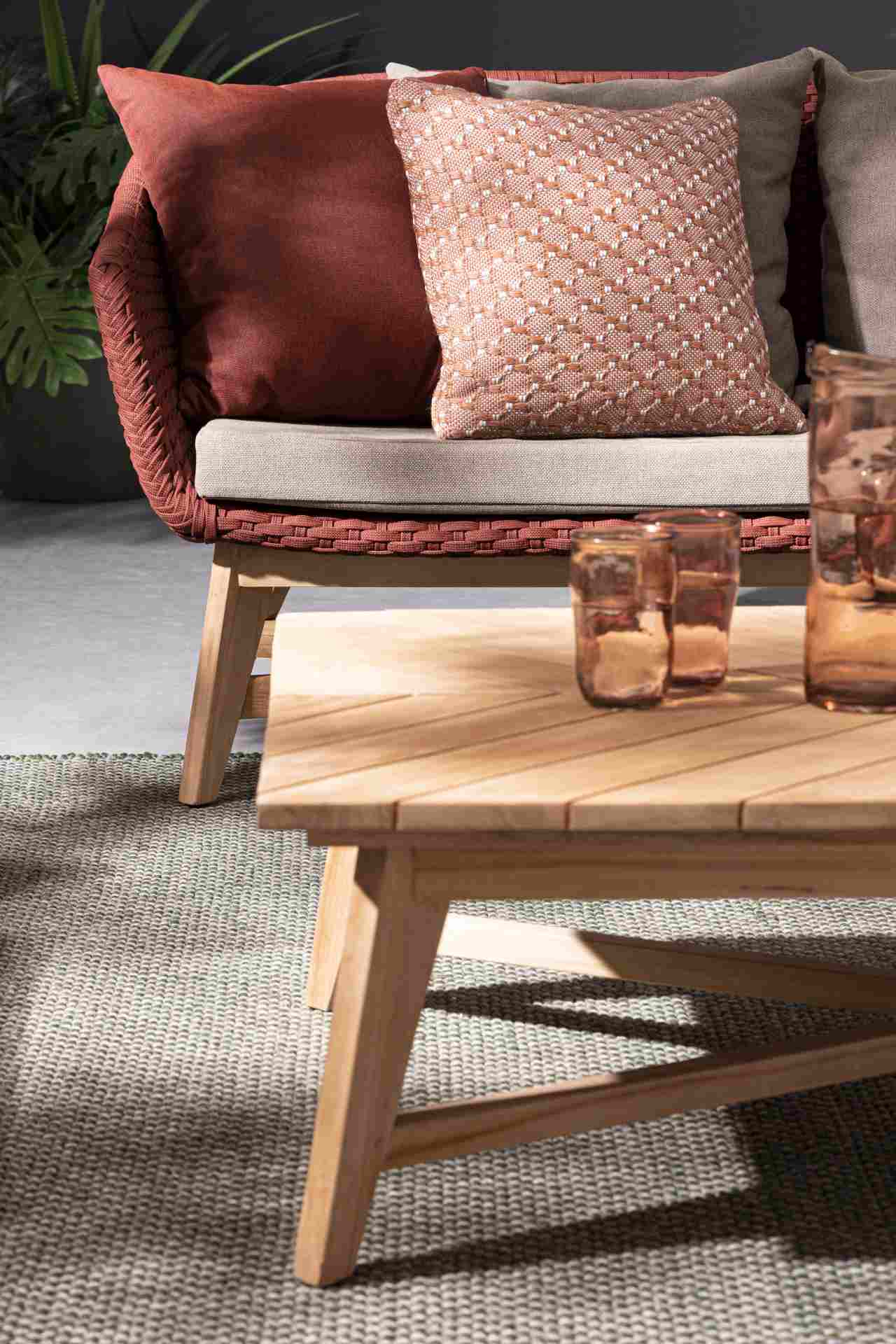 Wunderschönes Outdoor Sofa Coachella inkl. Kissen. Die Beine des Sofas sind aus FSC zertifiziertem Teakholz hergestellt und absolut witterungsbeständig. Das Gerüst des Sofas besteht aus wasserabweisendem und uv-beständigem Kunststoff (Polypropylen). Durch die hochwertige Quick and Dry Schaumstoffpolsterung ist das Sofa im Nu getrocknet.