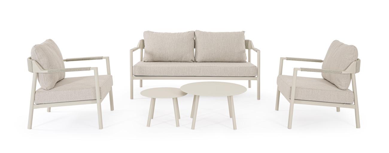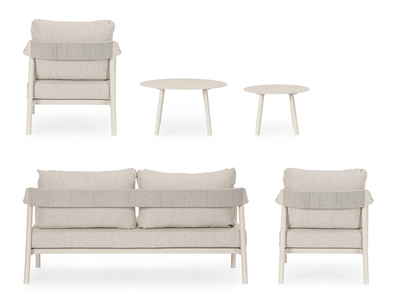 | Abmessungen BxTxH: | Sofa: 189x79x82 cm / Sessel: 74x79x82 cm / Tisch: Ø 70x34 / Ø 50x38 cm |