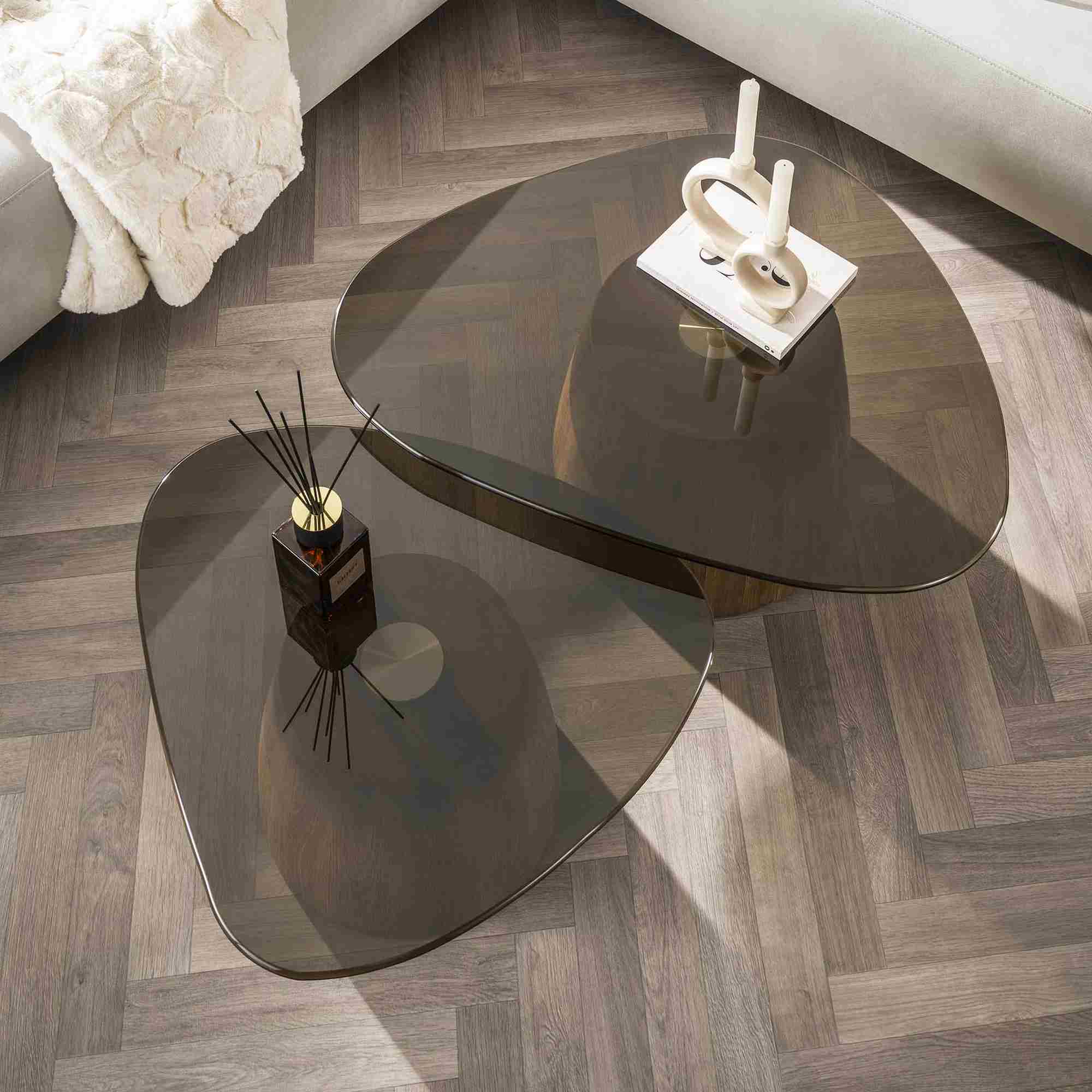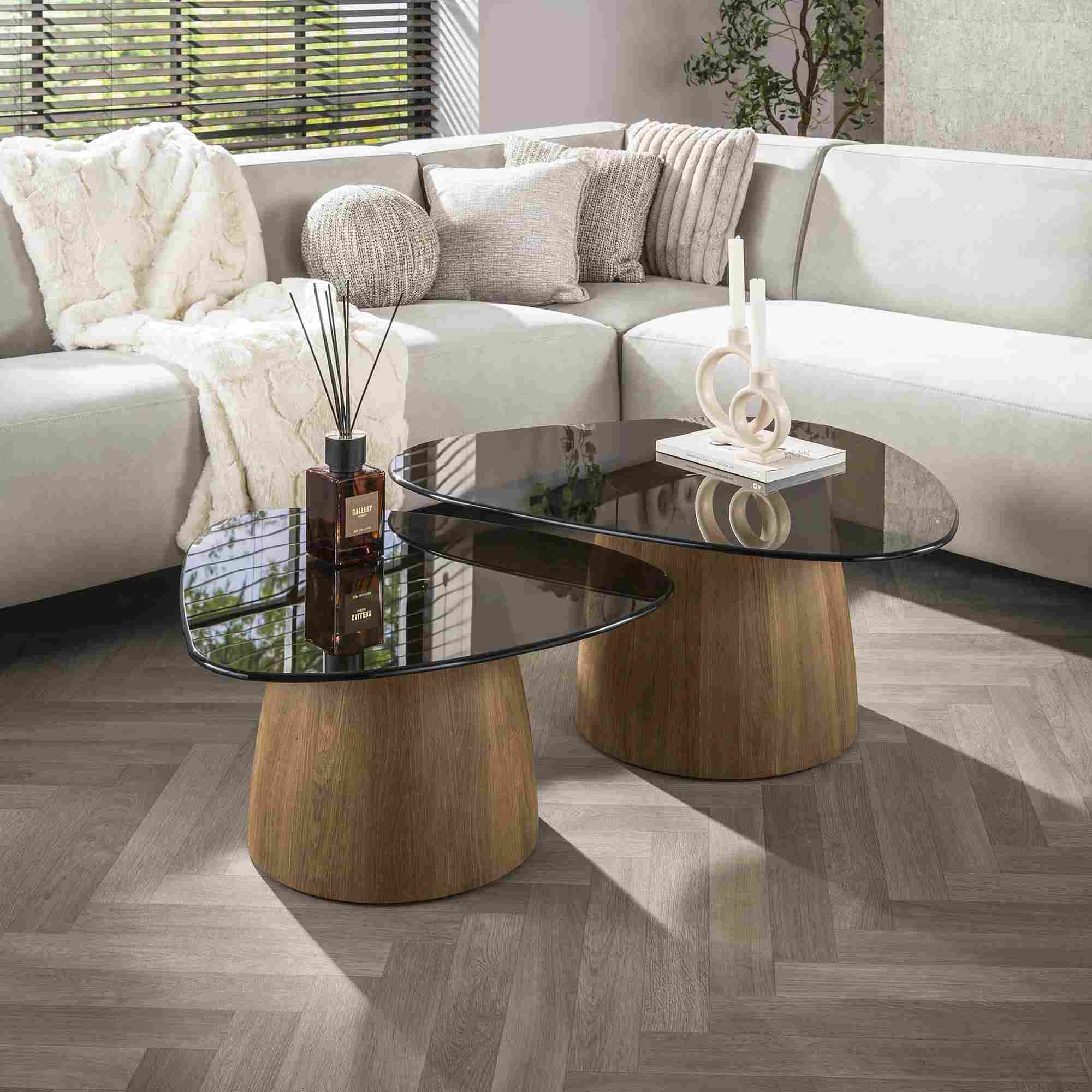 Produktinformationen "Otin Couchtisch-Set mit Rauchglasplatten und Gestell in Eichenoptik, Dreieckig"