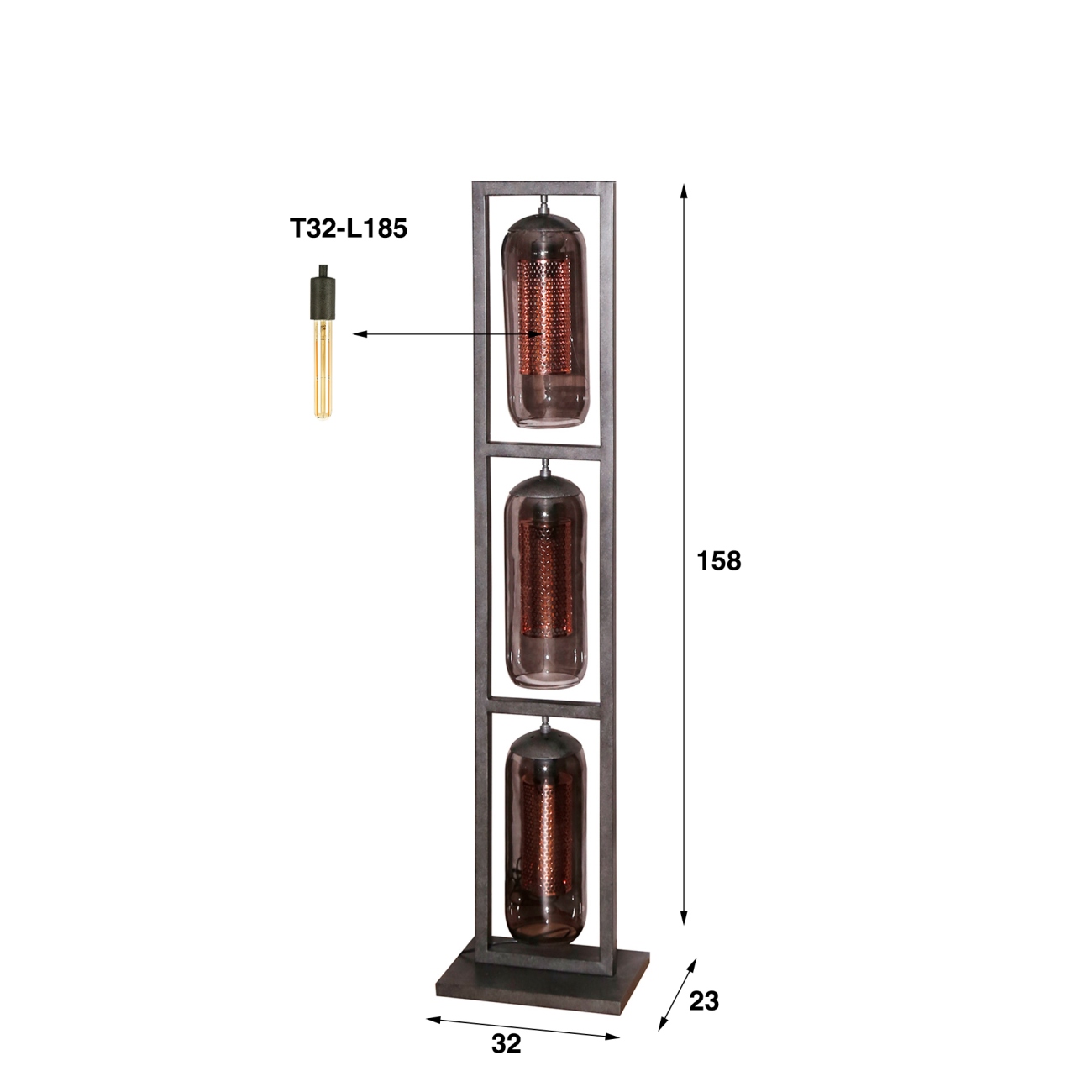 Lieferumfang: | 1 Stehlampe mit Metallgestell, 3 Glasschirme, Aufbauanleitung, 3 LED-Leuchtmittel Röhre T32-L185 18,5 cm |