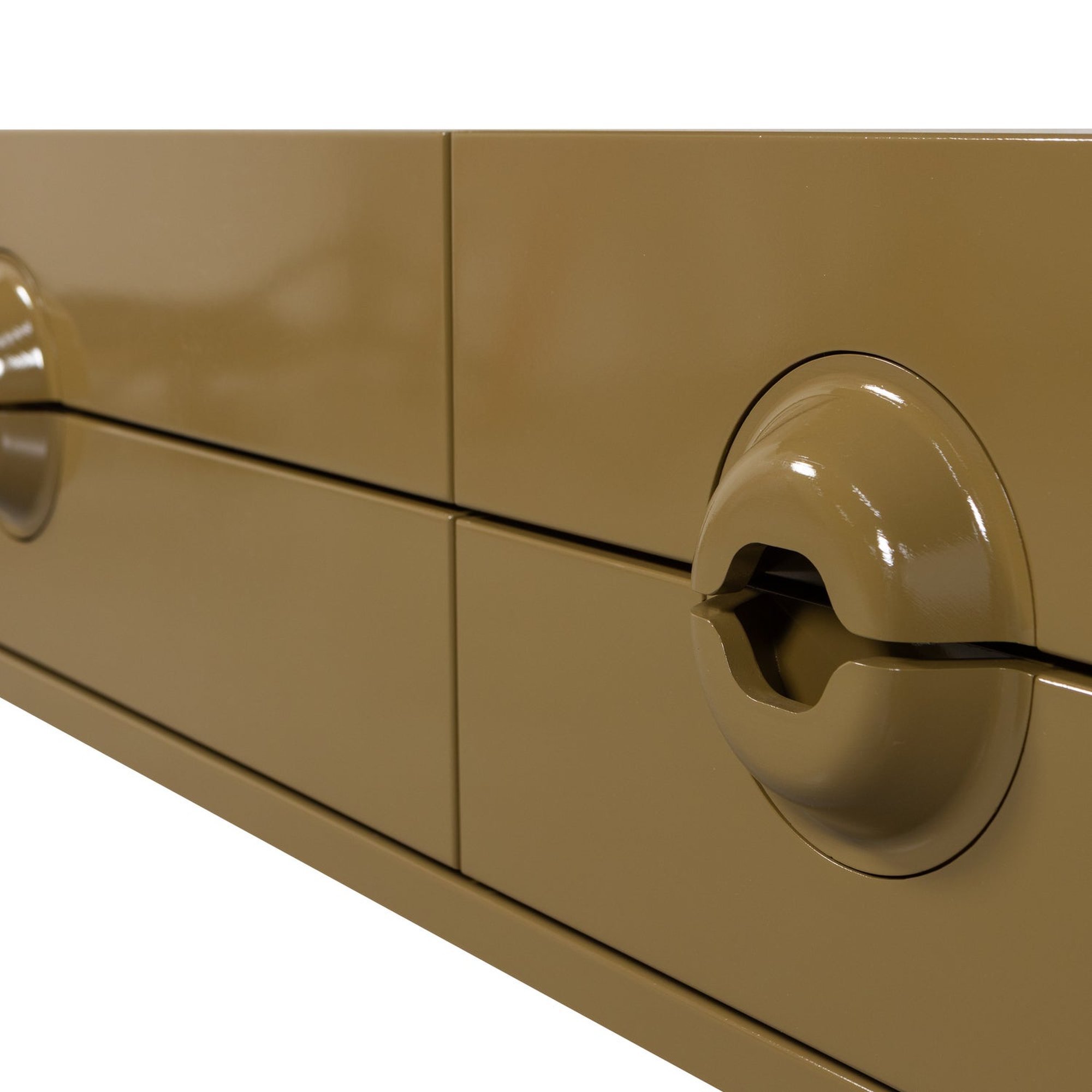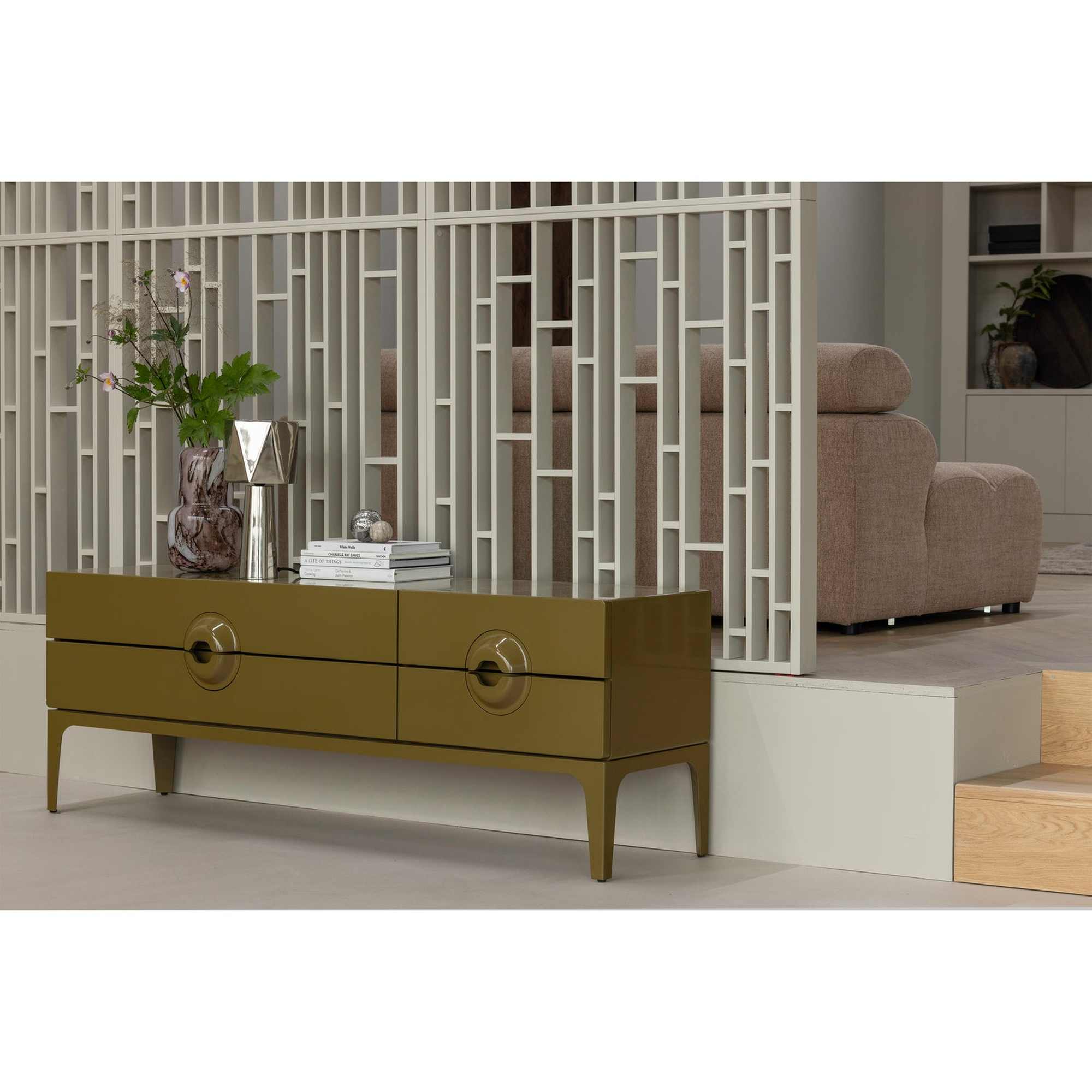 Das Merge TV-Board aus Holz in Honiggelb lädt Dich ein, Dein Zuhause neu zu erleben. Das elegante Design bringt wohltuende Wärme und moderne Struktur in Dein Wohnzimmer. Honiggelbe Oberflächen fangen sanft das Licht ein, während die klaren Linien und charakteristischen Griffe zu einem harmonischen Gesamtbild beitragen. Die vier praktischen Schubladen bieten Dir Platz, um Deine Lieblingsmedien und Zubehör geordnet zu verstauen und gleichzeitig einen aufgeräumten Look zu genießen. Das Zusammenspiel aus zeitlosem Stil und funktionalem Stauraum sorgt für ein Ambiente, in dem Du Dich rundum wohlfühlst.