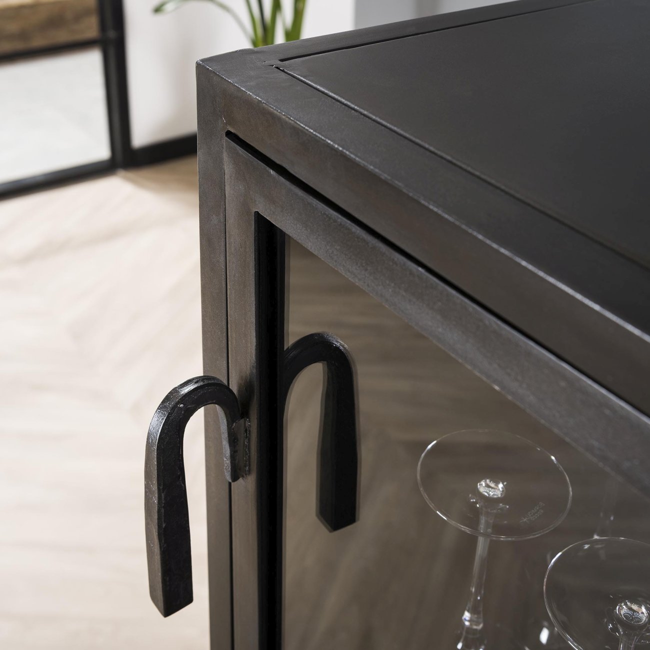 Hinweis (Material): | Die Farbe „Gun Metal“ ist ein dunkler Grauton mit metallischem Glanz. Der Used-Look und das industrielle Design sind charakteristisch für diese Vitrine., Die sichtbaren Schweißnähte und die geschliffene Optik sind charakteristisch für den Schrank und unterstreichen seinen industriellen Charakter. |