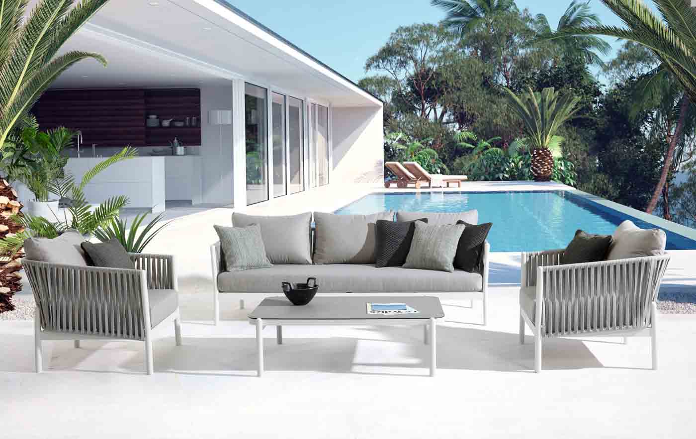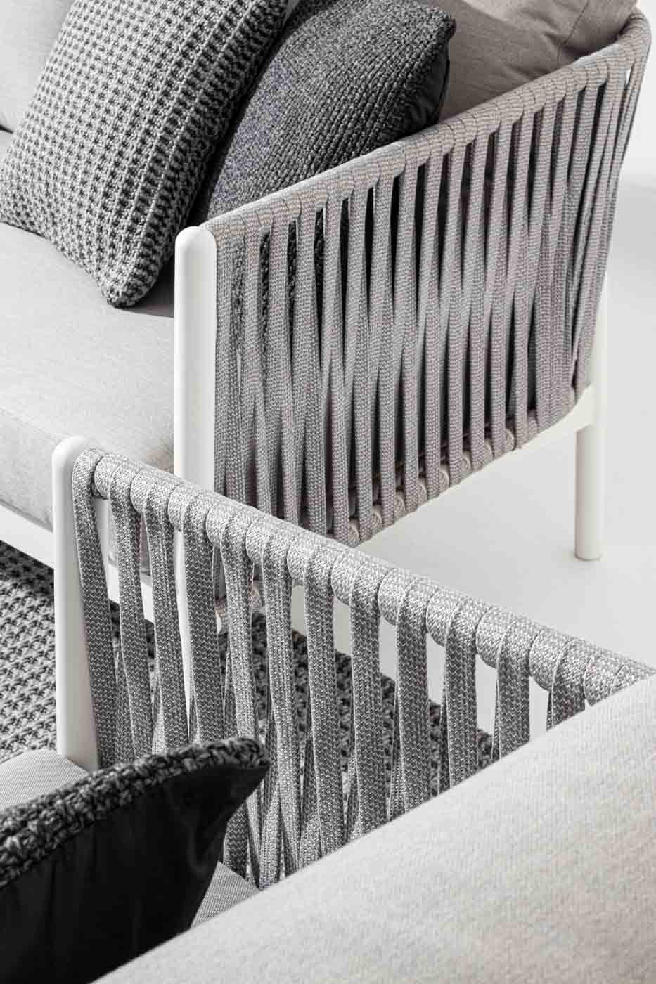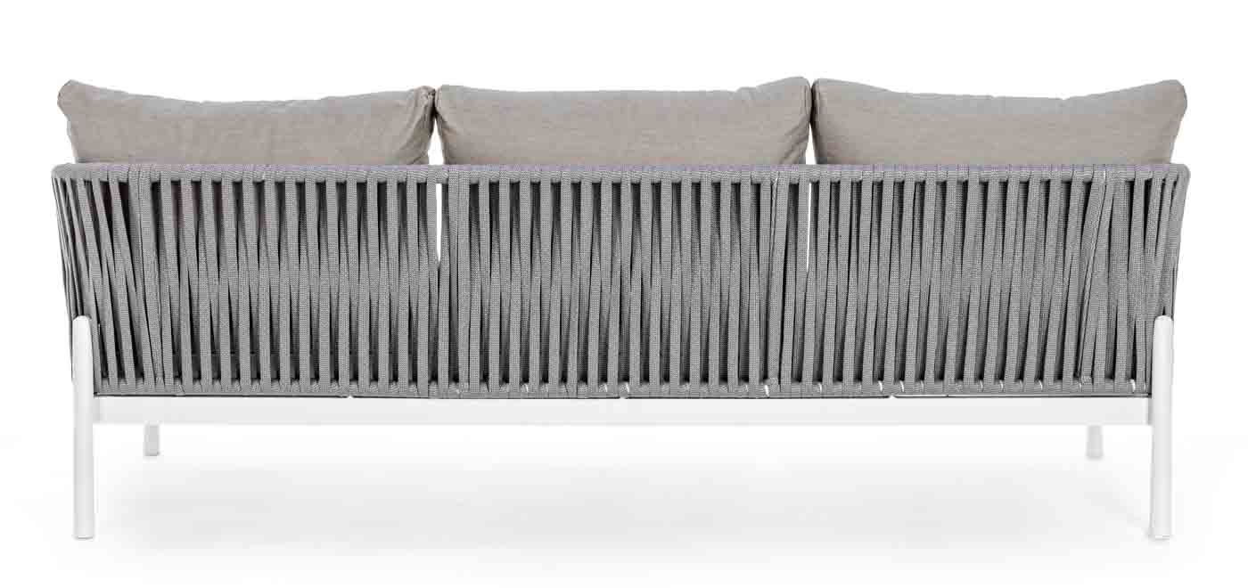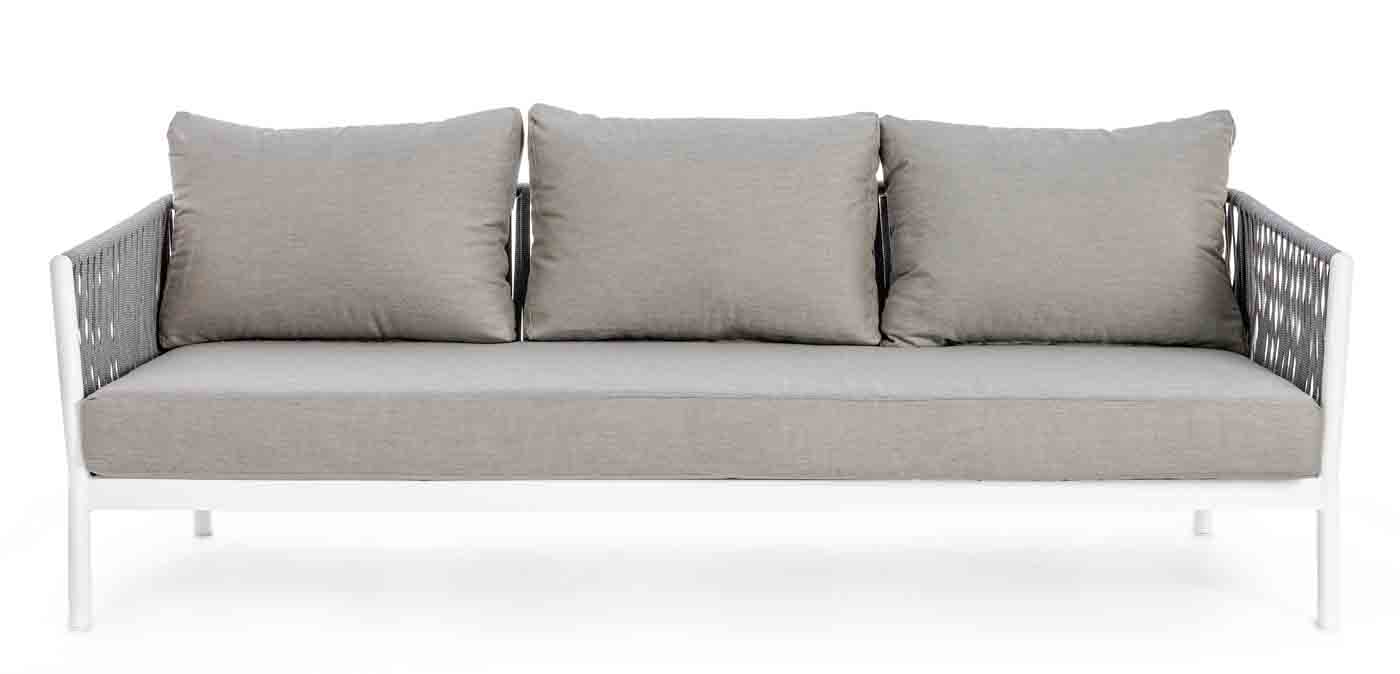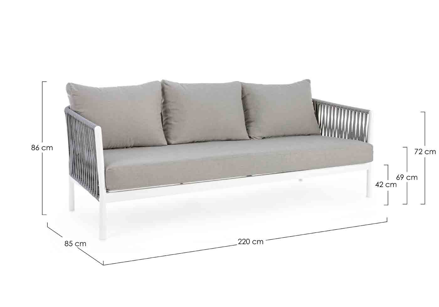 Zeitloses Sofa Florencia mit einer Gestell aus beschichtetem Aluminium. Das Sofa ist wasserabweisend und UV-beständig. Der Rahmen ist aus einem Kunststoffgeflecht gefertigt.