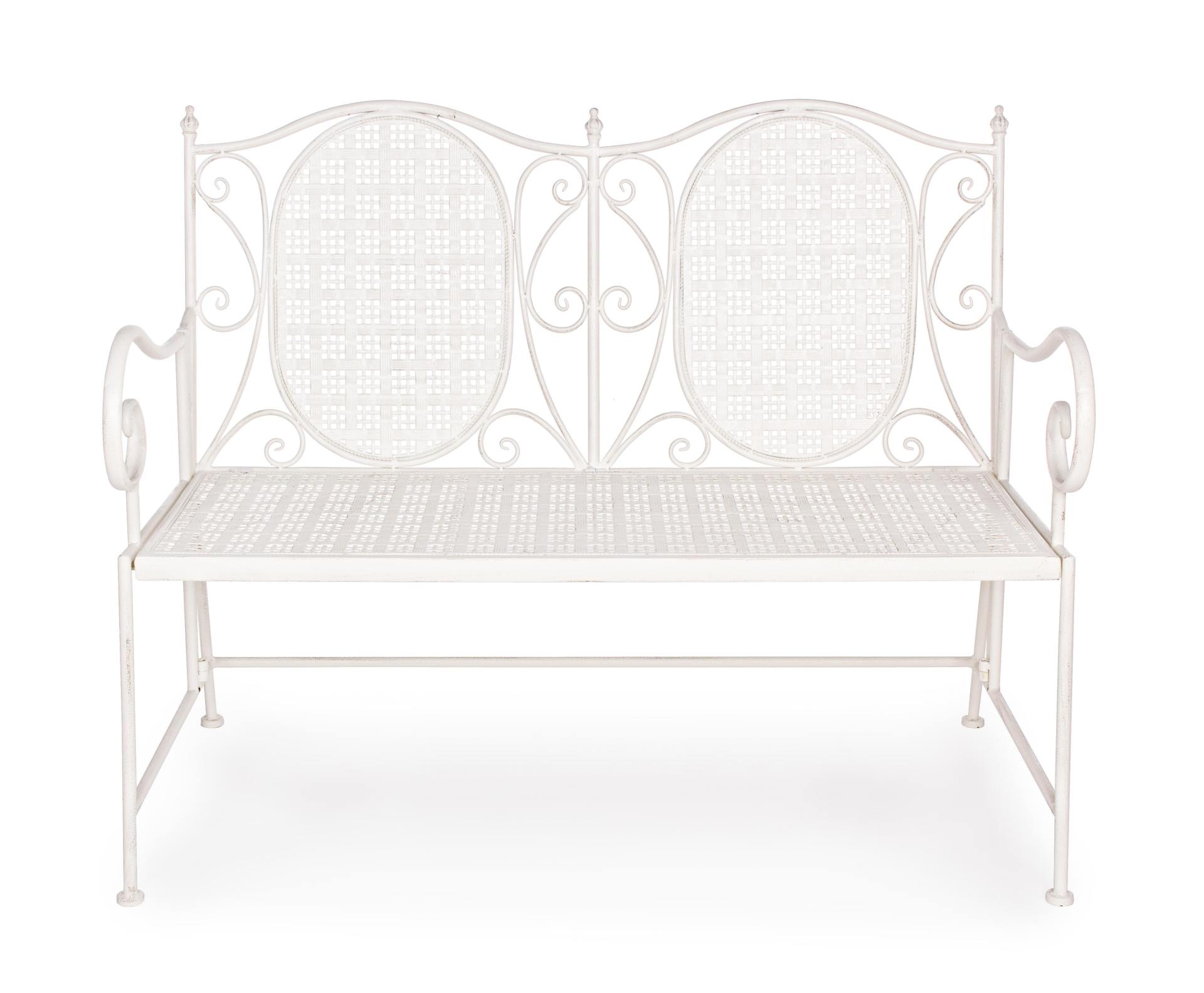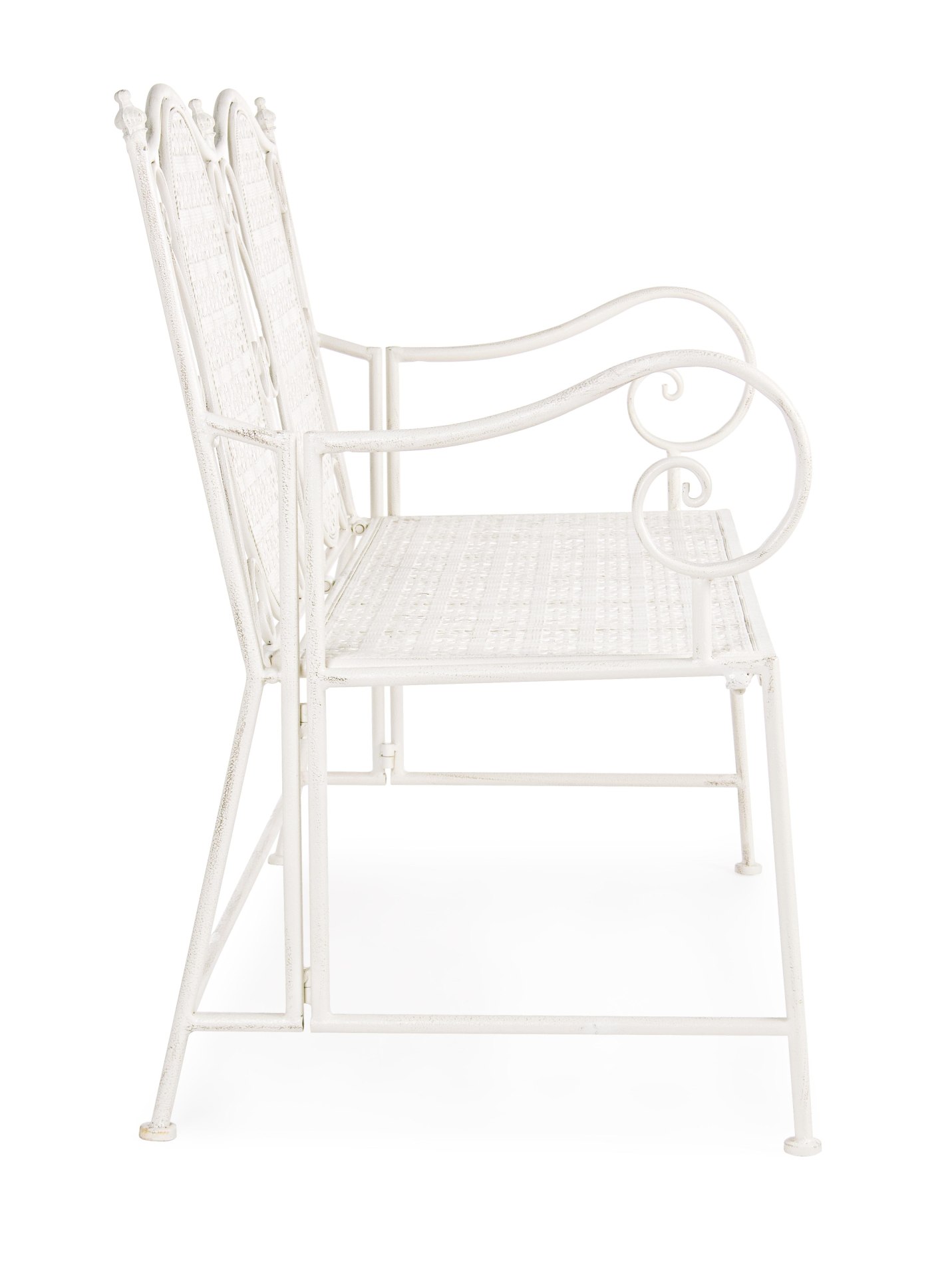 Filigrane Sitzbank Emily aus Metall mit geschwungenen Elementen und feinen Details. Das klassische französische Design lässt sich wunderbar mit vielen Einrichtungsstilen kombinieren und auch als Einzelstück ist diese traumhafte Sitzbank von Bizzotto ein echter Eyecatcher.