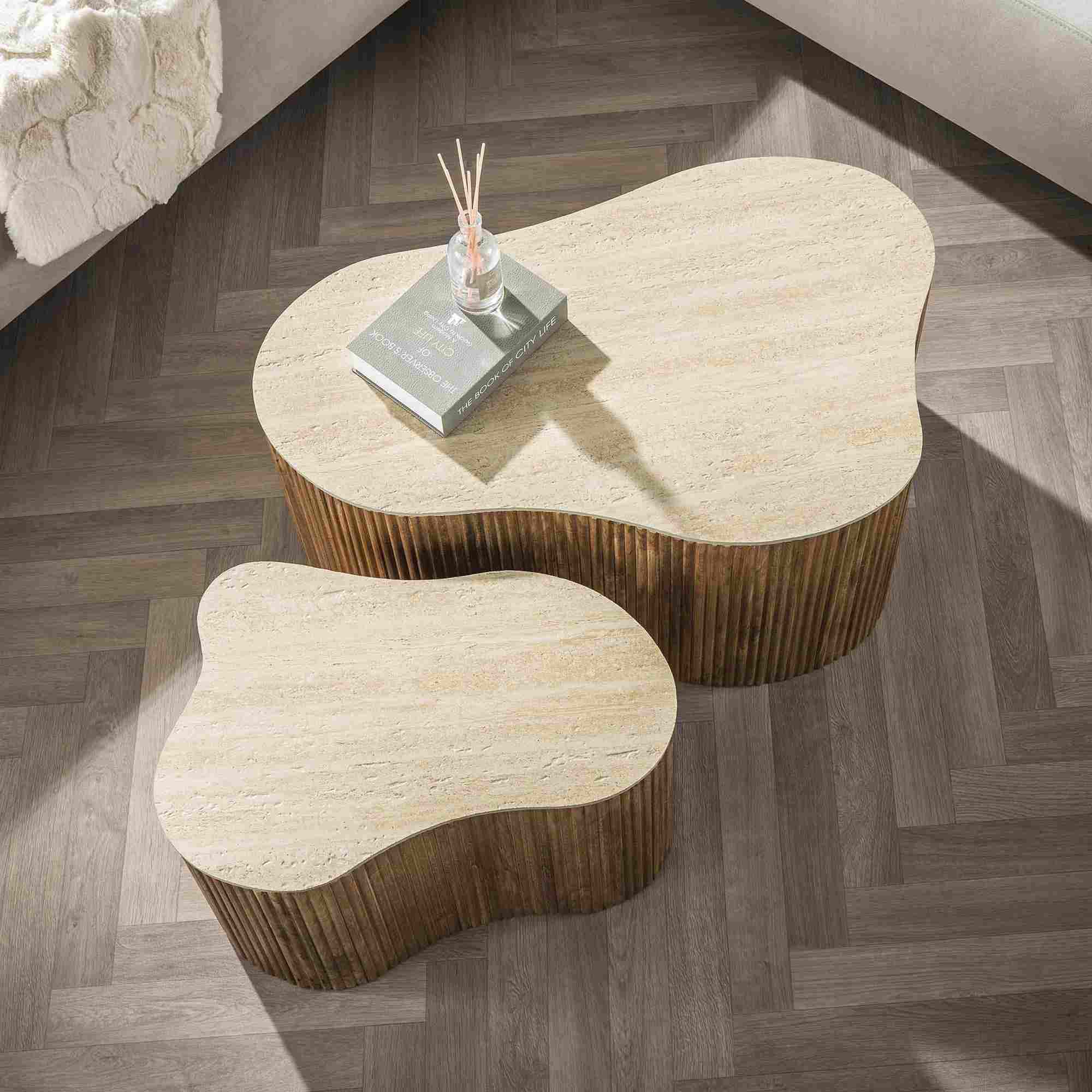 Couchtisch 2er-Set Tratin - Keramik in Travertinoptik, Sandfarbig