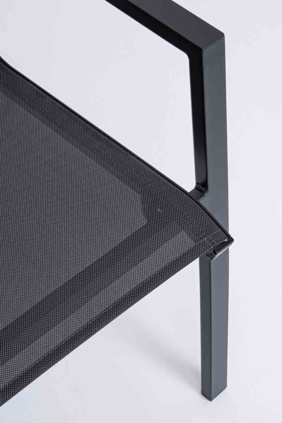 Gartensessel Krion aus Aluminium und Textilene für einen angenehmen Sitzkomfort. Die Armlehnhöhe mit 63,5cm lässt diesen Gartensessel unter viele Gartentische stellen, sollten die Stühle nicht genutzt werden, kann man diese platzsparend stapeln und verstauen.