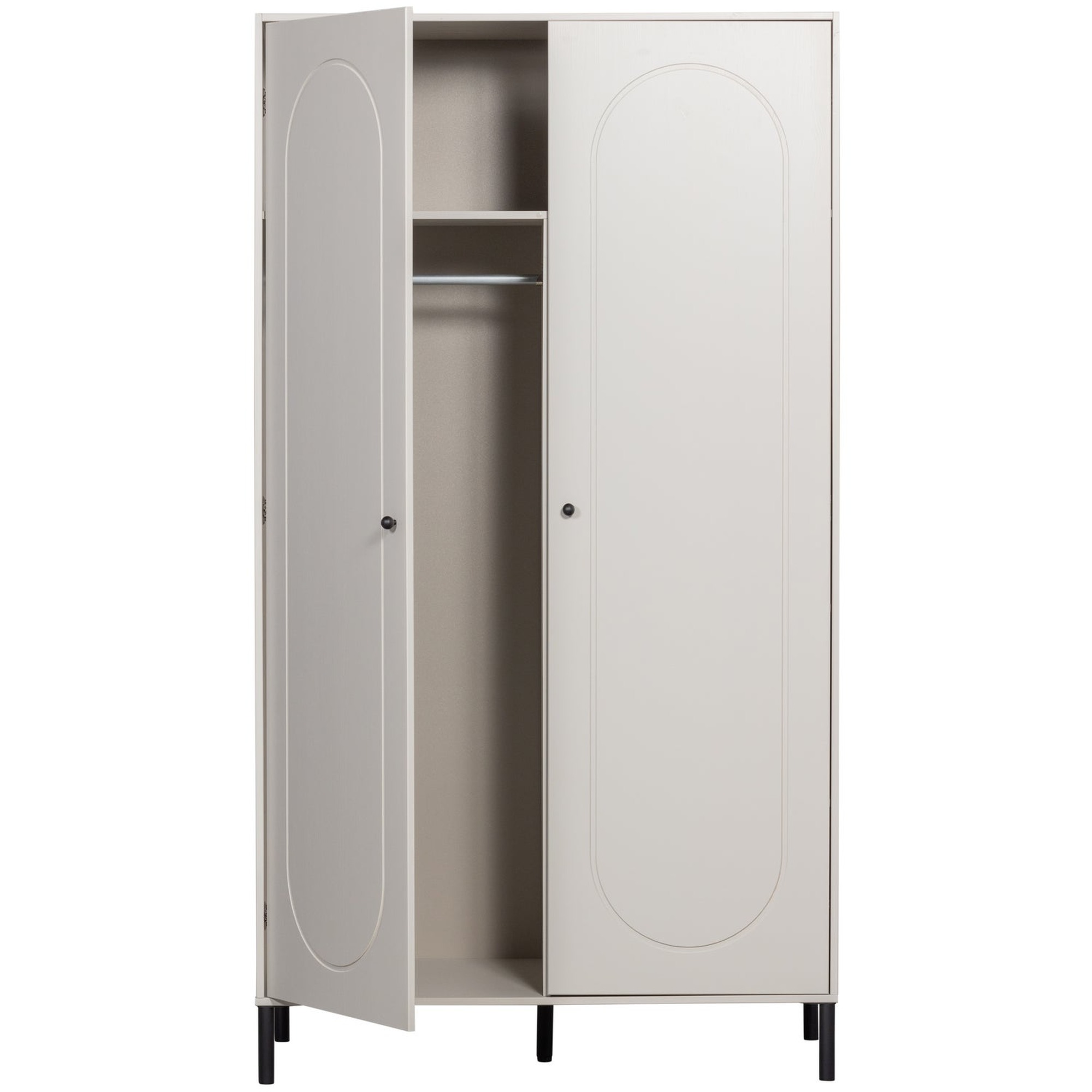 Mit diesem Kleiderschrank holst Du Dir ein Stück skandinavisches Lebensgefühl in Deine Räume. Die Kombination aus wolkengrau lackiertem Kiefernholz und klaren Linien lässt Deinen Schlaf- oder Jugendzimmerbereich ruhig und zugleich einladend wirken. Das feine Zusammenspiel von natürlichen Holzmaserungen und dem schlichten Metallgestell macht den Schrank zu einem vielseitigen Möbelstück, das sich gelassen in verschiedene Einrichtungsstile integrieren lässt. Genieße die Klarheit, die ein durchdacht gestalteter Schrank in Dein Zuhause bringt, und freue Dich über die aufgeräumte Wirkung, die das Design vermittelt.