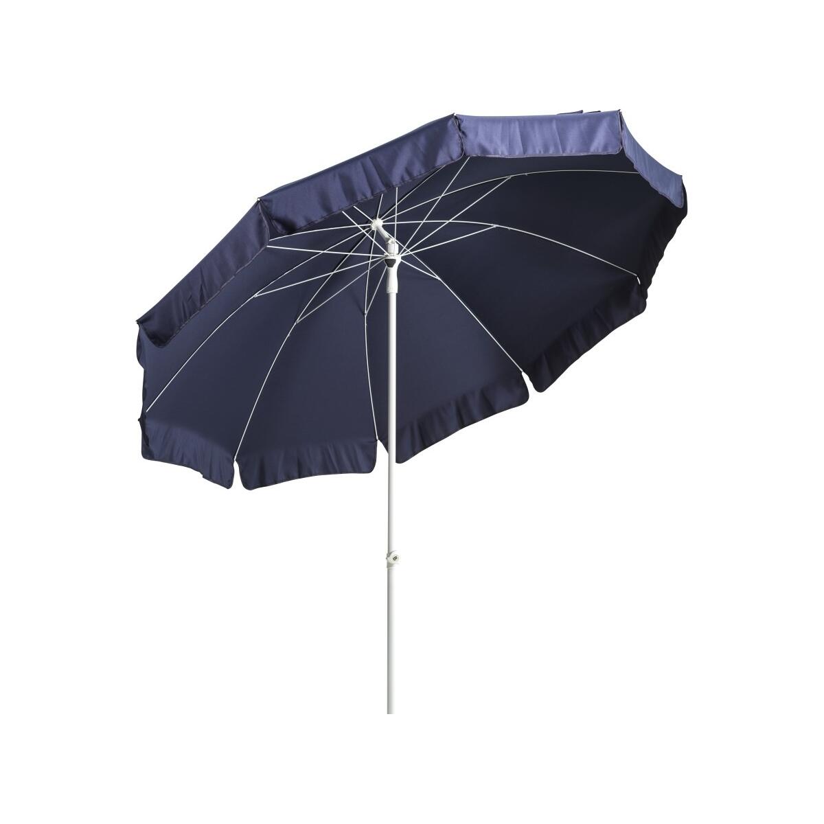 Mit diesem funktionalen Schirm verleihst Du Deinem Außenbereich eine moderne, klare Linie. Das dunkelblaue Tuch harmoniert mit dem weißen Gestell und sorgt für einen zeitgemäßen Akzent, der sich vielseitig kombinieren lässt. Ob Frühstück auf dem Balkon oder Lesestunde im Garten – der Schirm schafft eine angenehme Atmosphäre, in der Du zur Ruhe kommst und den Sommer genießt. Die runde Form wirkt einladend und fügt sich harmonisch in unterschiedliche Umgebungen ein.