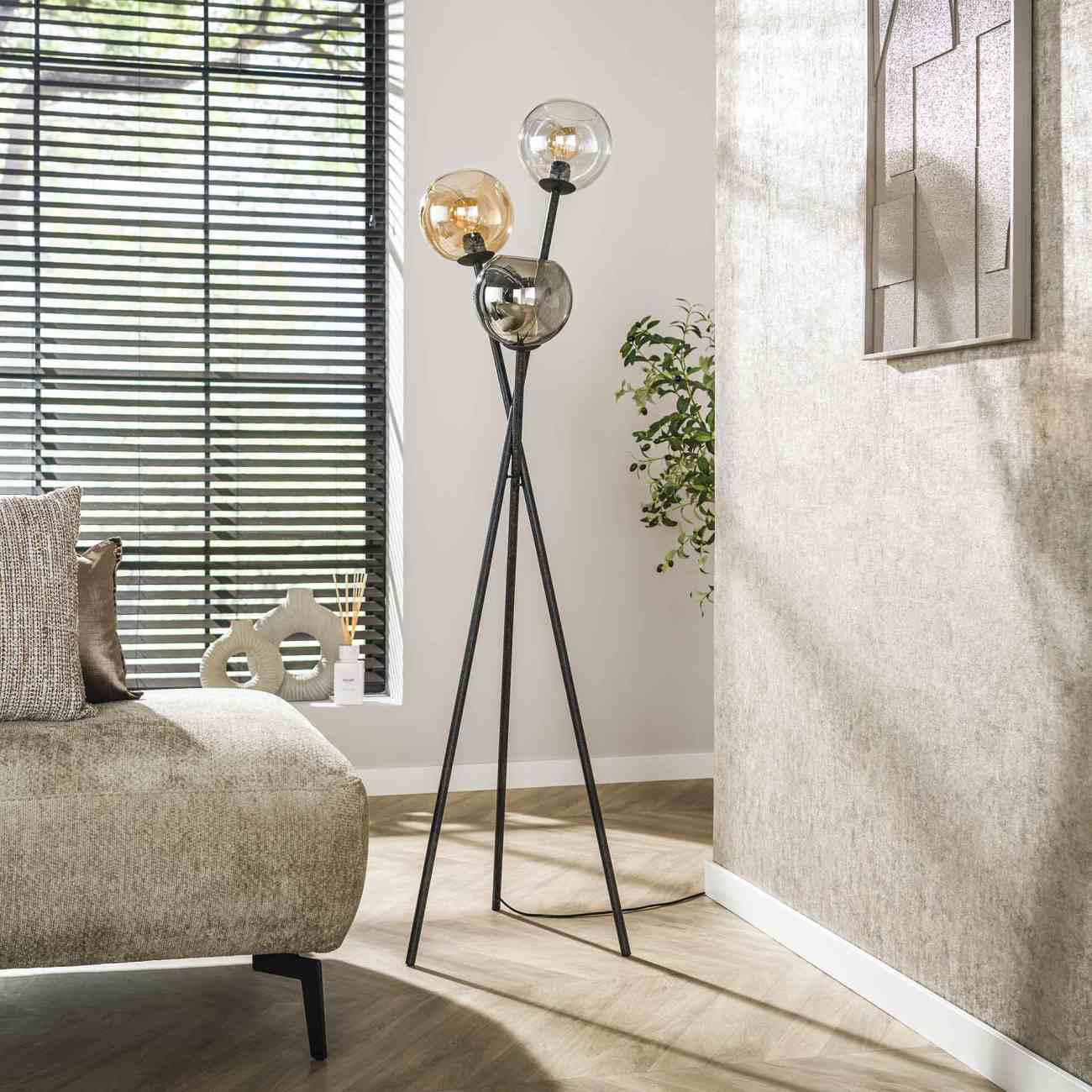 Produktinformationen "Stehleuchte Bulbusa Metall und Glas, modern 3-flammig, Chrom Bernstein Transparent, LED inklusive"