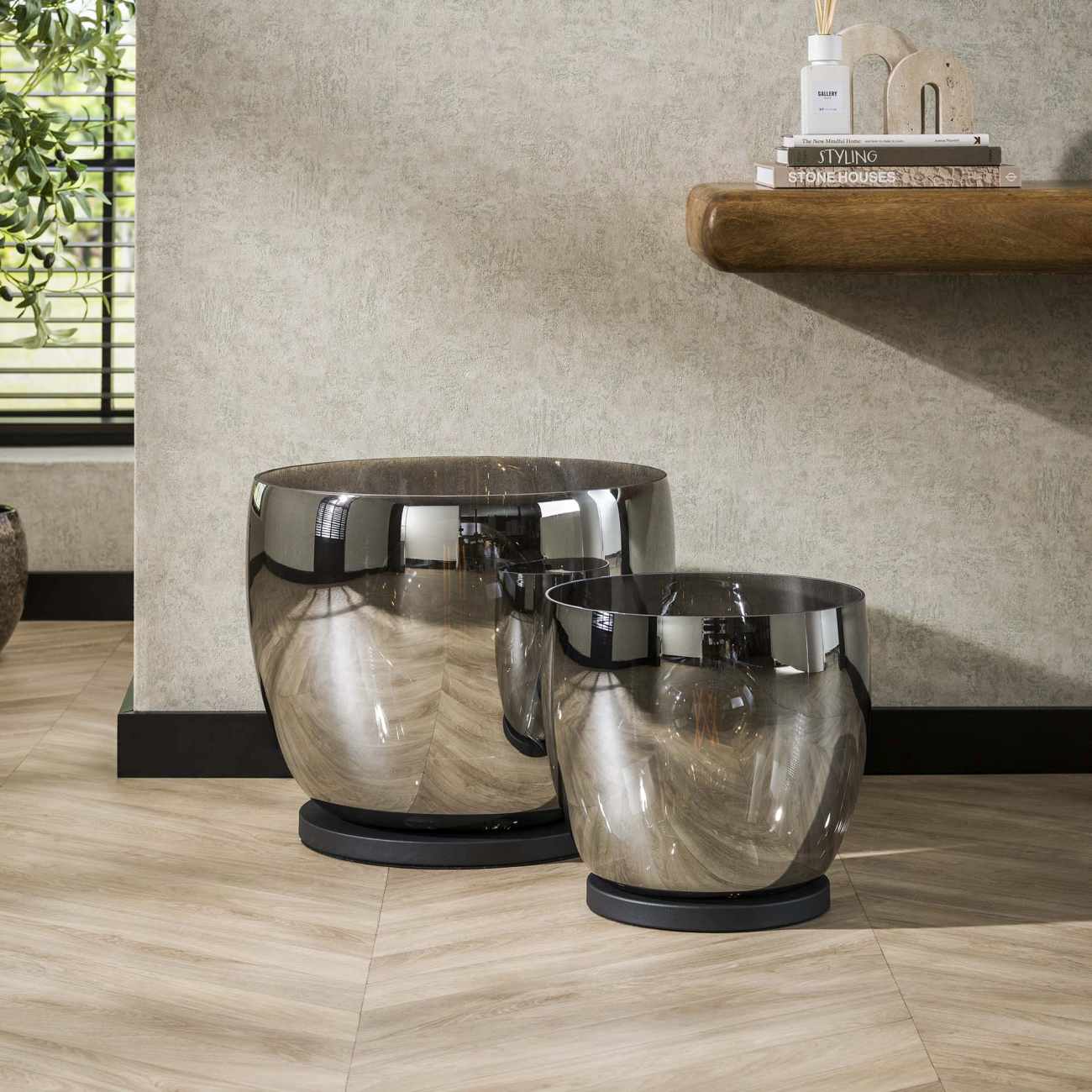 Besonderheiten: | Glasstruktur mit Rauchglas-Optik mit stilvollem Metallsockel |