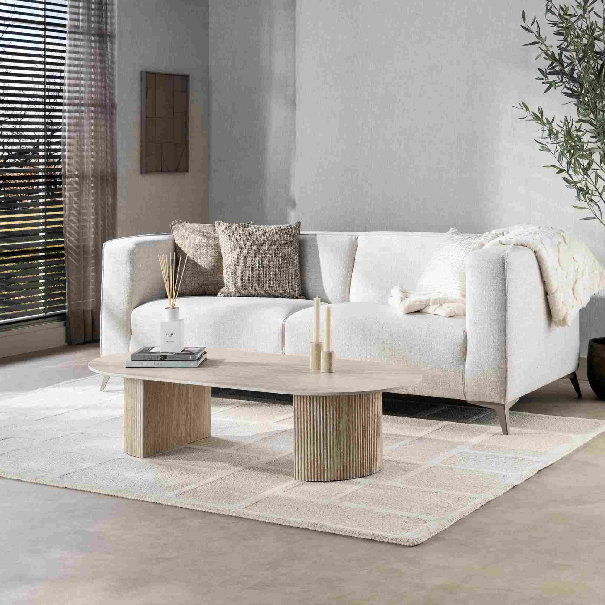 Traonira Keramik Couchtisch 135 cm in Travertinoptik, Wellengestell